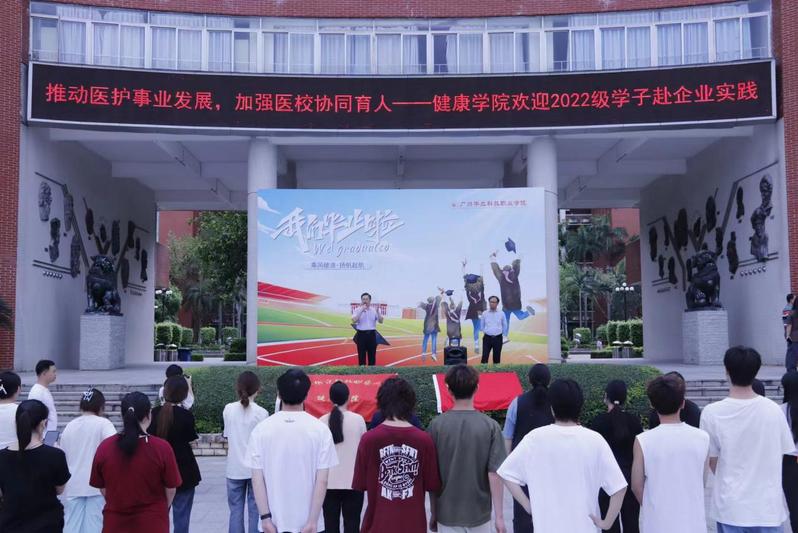 凤凰花开,骊歌荡漾。2024年7月2号上午九点,健康学院2022级护理专业实习生欢送会在综合楼广场举办。健康学院院长雷毅雄、健康学院党支部书记孟允煌院长、温伟胜副院长、学生管理办公室主任刘伟鑫主任、相关指导老师及22级护理专业去往韶关人民医院、韶关中医药、茂名石化医院实习的同学参加了此次欢送会。