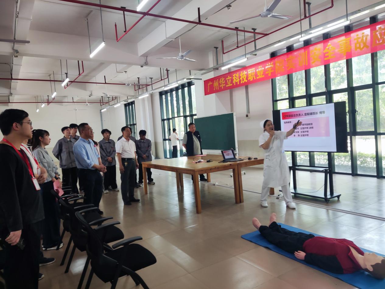 为深入普及应急救护知识,切实提升师生应对突发事件的处置能力,4月15日下午实训中心在广州华立科技职业学院(云浮校区)开展”实训安全事故应急演练”系列活动。健康学院承担了“心肺复苏培训与演练”环节。副校长高尧来、校长助理叶春桃、健康学院院长雷毅雄、实训中心主任张磊、电力学院副院长马洪德等师生代表等参加了活动。本次活动由健康学院护理系教师团队负责培训业务,旨在提升师生急救技能,普及生命急救知识。
