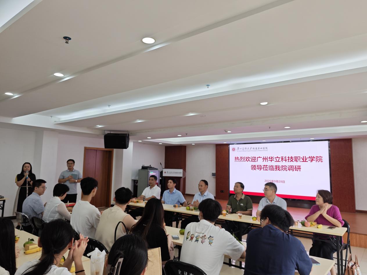 在国庆、中秋双节来临之际,2025928日下午,我校廖俊杰校长、教务处孙丽英处长、实践教学科韦建林科长、健康学院雷毅雄院长、李国良副院长、行政主任梁瑞云、实习指导老师邓香华、杨鹏一行赴广州医科大学附属第四医院访企拓岗,给健康学院2023级在该医院进行临床实习的华立学子们送去节日的关怀。广州医科大学附属第四医院郭建军副院长,科教科刘志毅副科长、陈彩青科护长,张琴口腔科主任等院领导热情参与了中秋慰问活动。