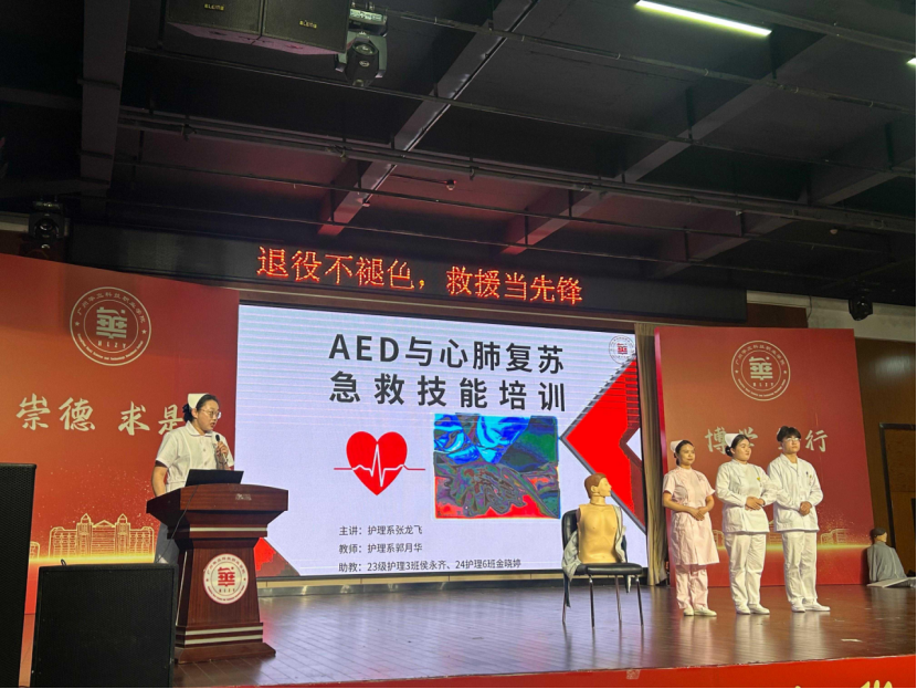 随后,健康学院护理系教师张龙飞围绕“认识心脏骤停与‘黄金四分钟’”这一主题,展开了系统而全面的讲解。张老师结合生动的实际案例,详细剖析了心脏骤停的识别方法、应急反应系统的启动流程以及心肺复苏(CPR)与自动体外除颤器(AED)的正确使用方法。通过深入浅出的讲解,让在场师生对急救知识有了更为深刻、全面的认识。