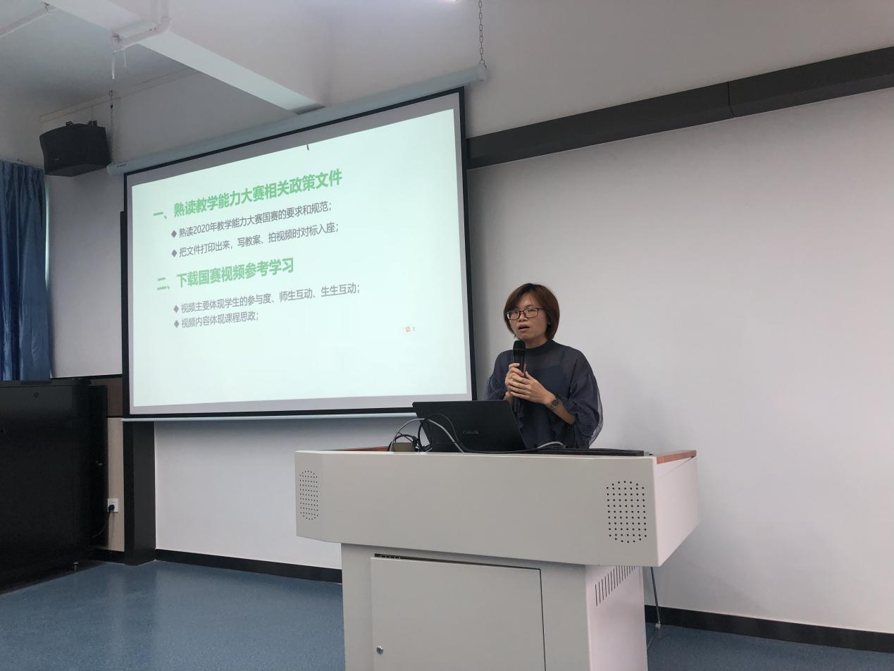 吴老师对教学能力大赛前期准备工作分五个方面作了分享。强调老师要熟读教学能力大赛的相关政策文件、下载国赛视频参考学习及在教学团队建设、课程选择等相关注意事项。最后播放了去年获奖的教学能力大赛的视频,对视频的拍摄和教案的撰写要求分享了她的看法。