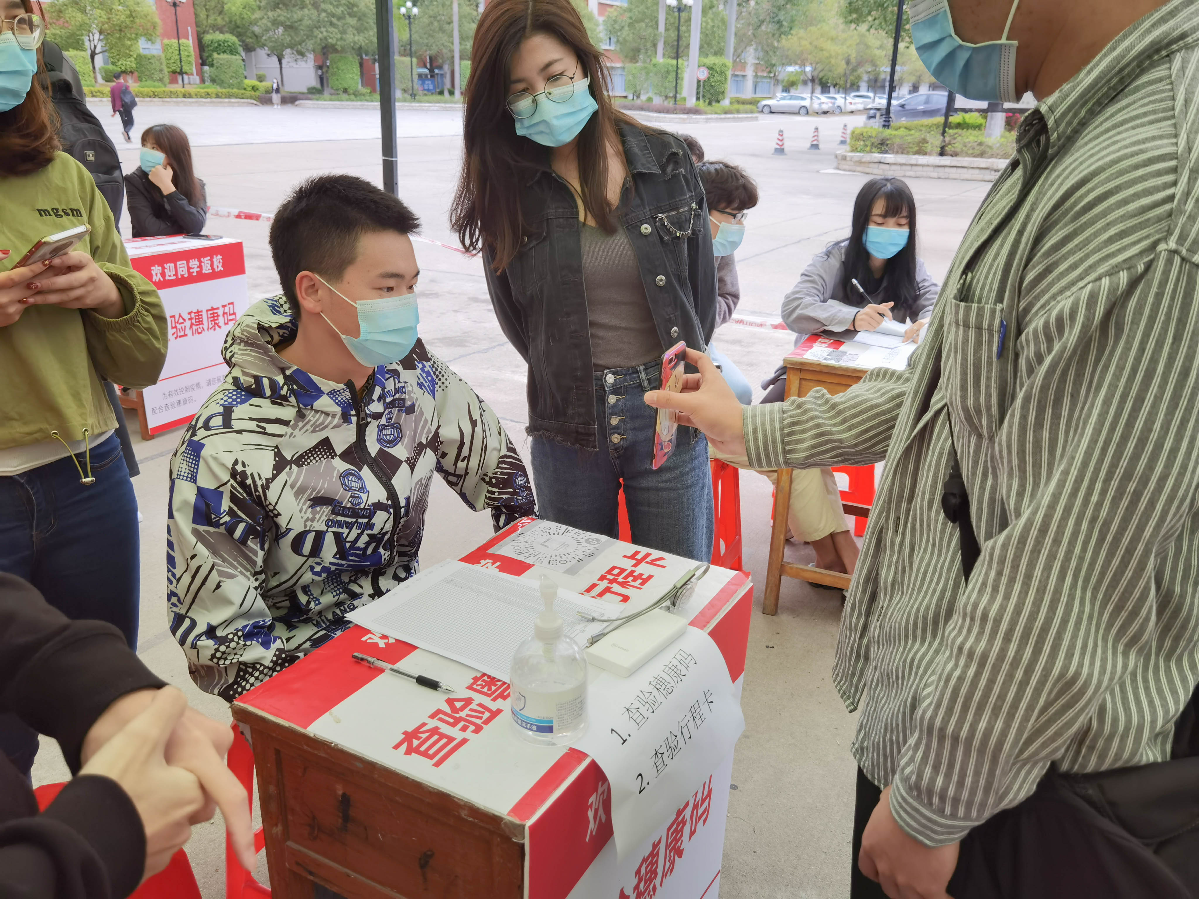 每位同学回校都佩戴了口罩,依次排队测体温、检查穗康码、行程卡,确保师生生命安全和身体健康。