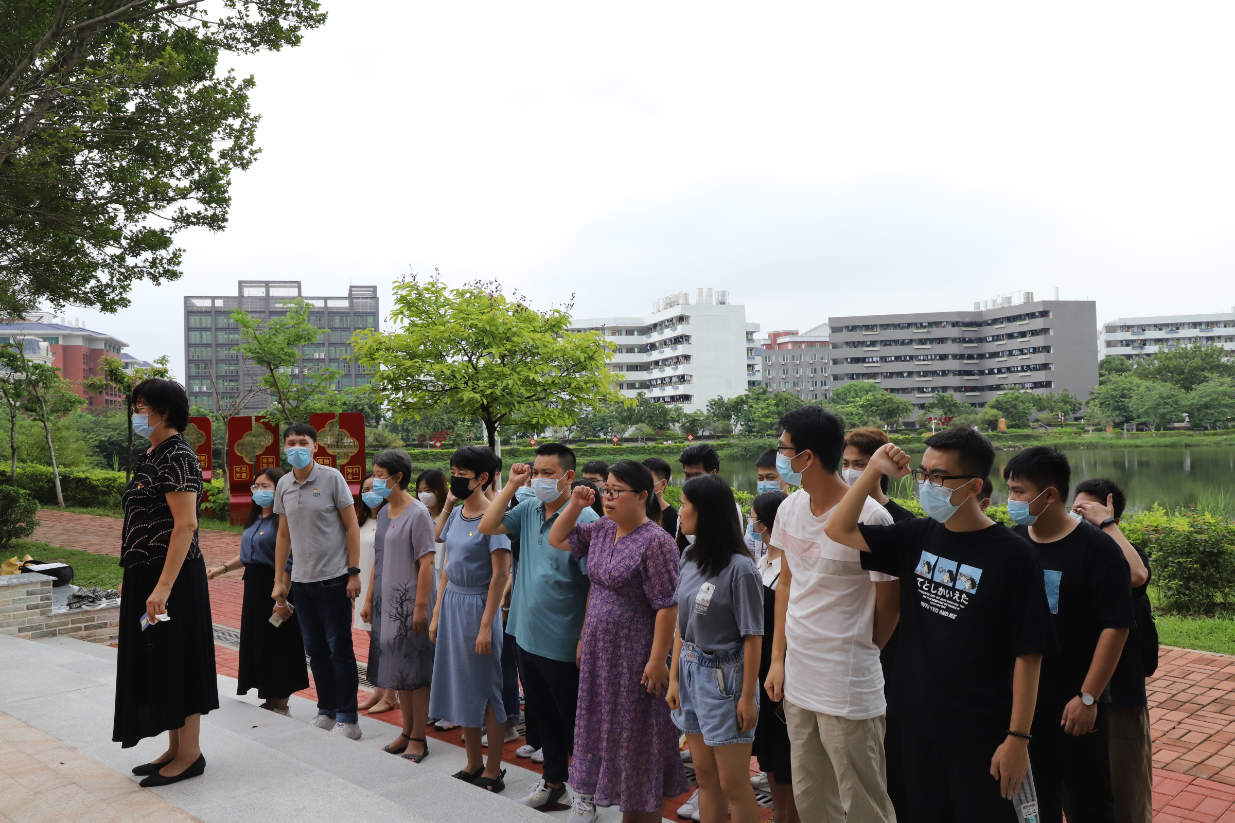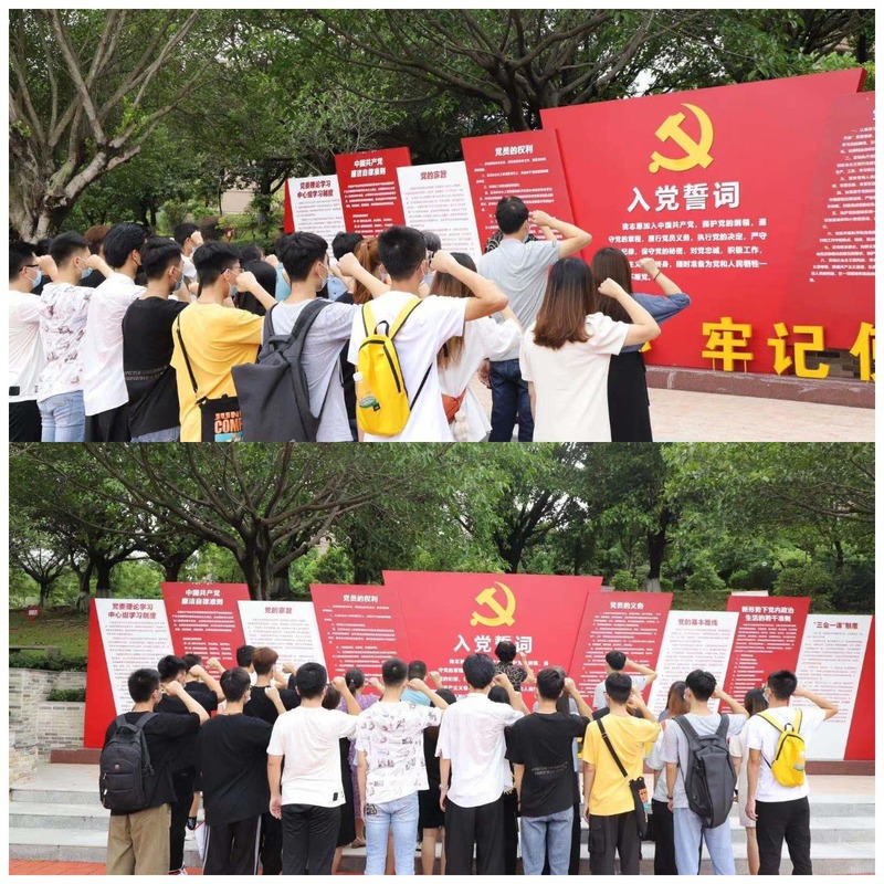 为庆祝中国共产党成立100周年,计算机信息工程学院党支部于2021年6月24日星期四12:00在华立湖举办了新党员宣誓,老党员重温入党誓词活动。参于此次活动的人员有:计算机信息工程学院党支部书记王建华同志、党支部副书记杨涛同志,各党员教师、预备党员、以及党建小组成员