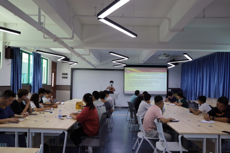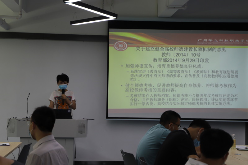 9月3日下午,我院召开全院教师会议,认真贯彻传达上级精神。针对学校工作实际,认真学习了《广州华立科技职业学院师德专题教育实施方案》《广东省加强新时代高校教师队伍建设改革实施意见》《新时代高校教师职业行为十项准则》《华立园教职工十要十不准》等有关文件和规定精神,进一步明确了师德师风教育月活动指导思想、重要意义、目标、任务、具体要求和方法步骤,对重点工作的落实作了具体部署,为师德师风教育月活动的开展打下了良好基础。