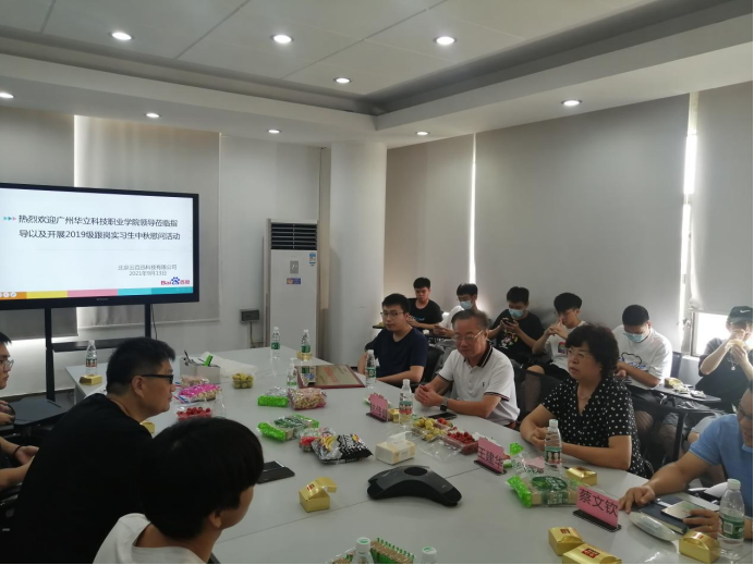 9月13日,中秋佳节之际,广州华立科技职业学院党委书记林伟健、计算机信息工程学院院长王建华、校外教学副主任蔡文钦、校外干事黄志强老师一行到北京云百讯科技有限公司佛山分公司看望2019级跟岗实习的65位学生,开展中秋节慰问活动。