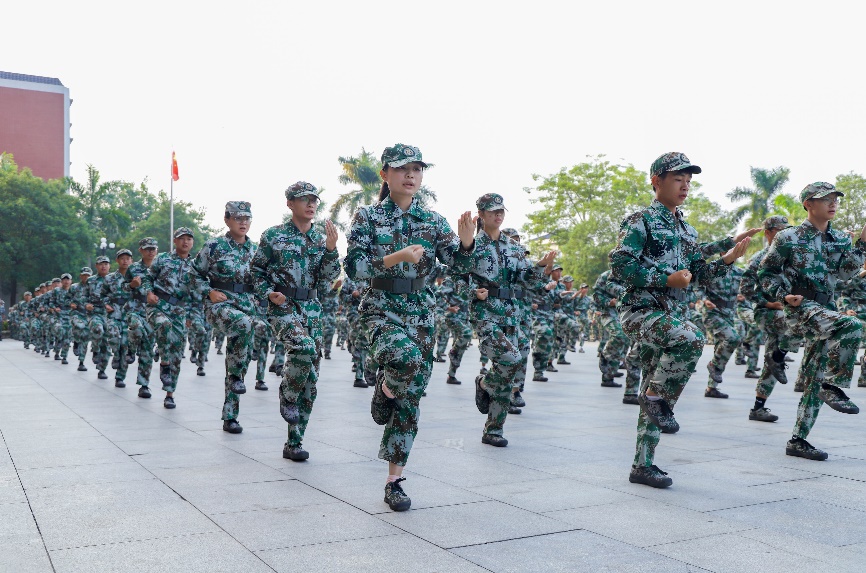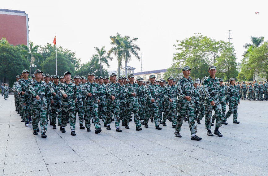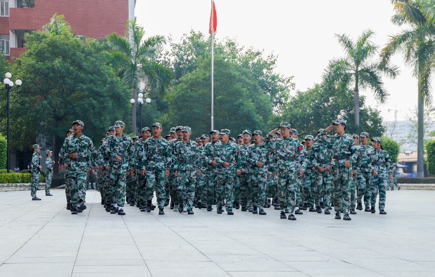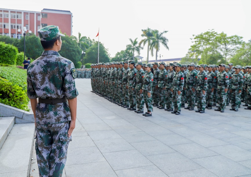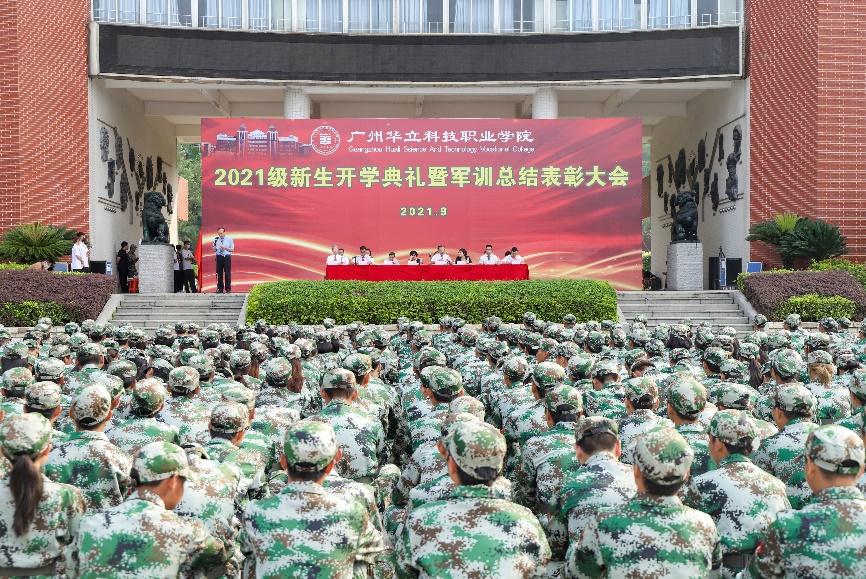 9月18日上午7点30分,广州华立科技职业学院在综合楼前举行2021年新生开学典礼暨军训总结表彰大会。