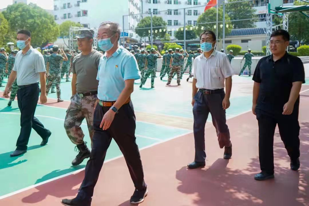 国旗队升起国旗,全体参会人员奏唱国歌,在雄壮的检阅进行曲的伴随下,学校领导在指挥官的陪同下检阅了各军训方队,军训汇演正式开始。各营地分别展示了分列式、方正队、军体拳、匕首操。