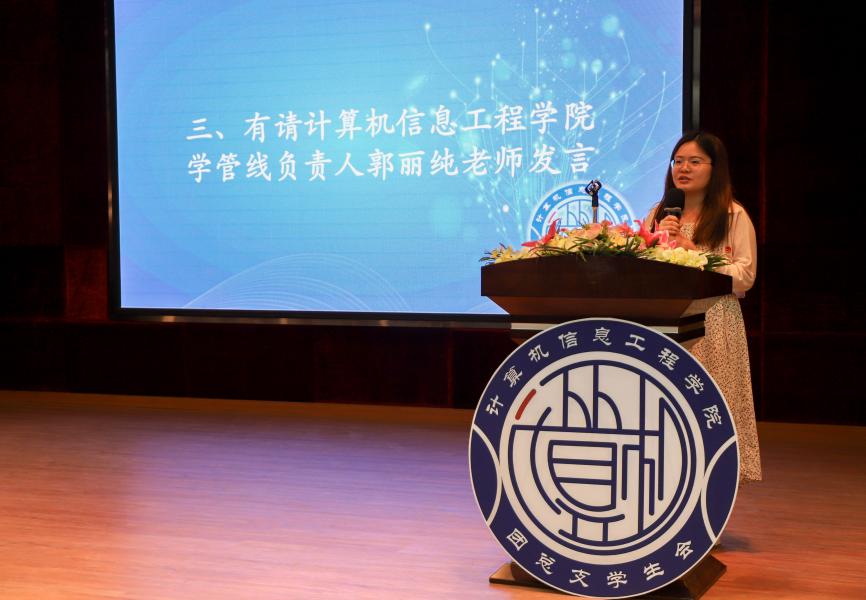 大会第二项议程奏唱会歌结束后计算机学院学管线负责人郭丽纯老师上台致辞。致辞中,郭老师对团总支学生会的新成员表示祝贺,并在结尾提到团总支学生会的八字箴言:传承、创新、团结、自信。相信在大家的携手同行奋力拼搏之下,团总支学生会的明天一定会更加璀璨夺目。