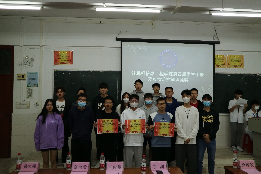 经过三个环节的激烈竞争,最终有三支队伍获胜,分别是第一名软件二班、第二名计网一班、第三名软件一班。最后由计算机信息工程学院温海浚老师、吕文平老师、庾源政老师分别为第一名、第二名、第三名获奖班级颁发奖状并合影留念。