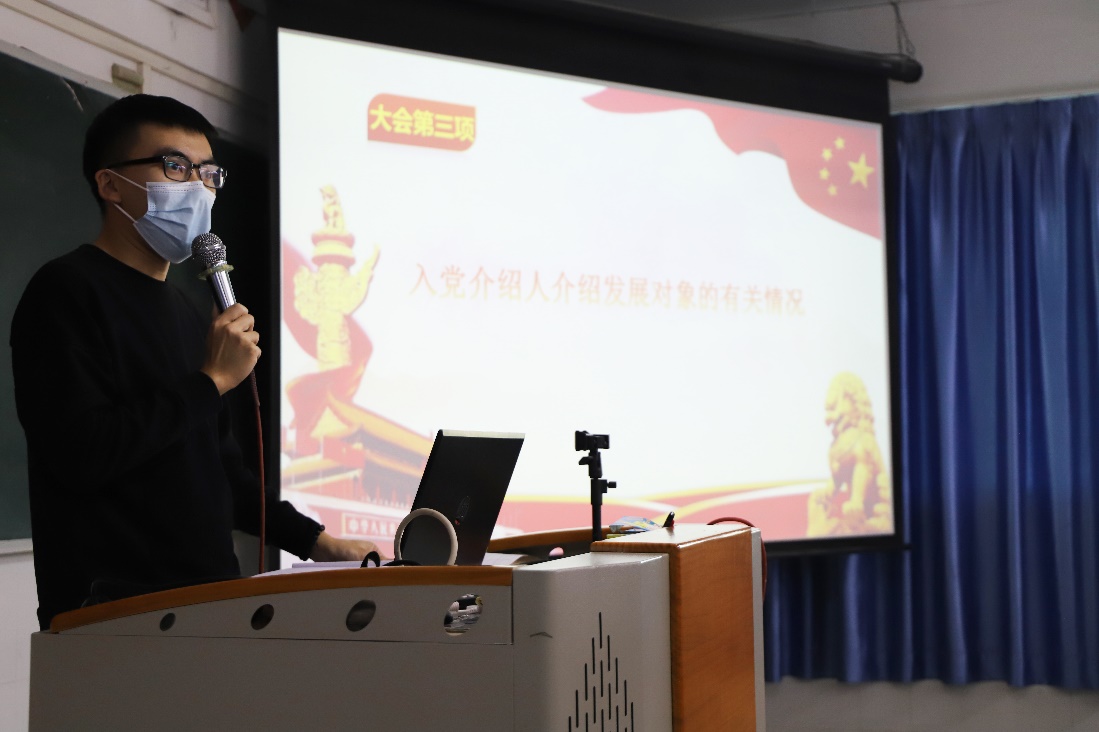 紧接着,陈江鸿同志介绍了发展对象的在校表现,表示谢浩贤等14位发展对象的政治立场坚定,工作踏实努力,学习勤奋,符合党员发展。并强调新一批的预备党员要时刻牢记使命、不断学习,不断的提高自己,在思想上与行为和党保持高度一致。