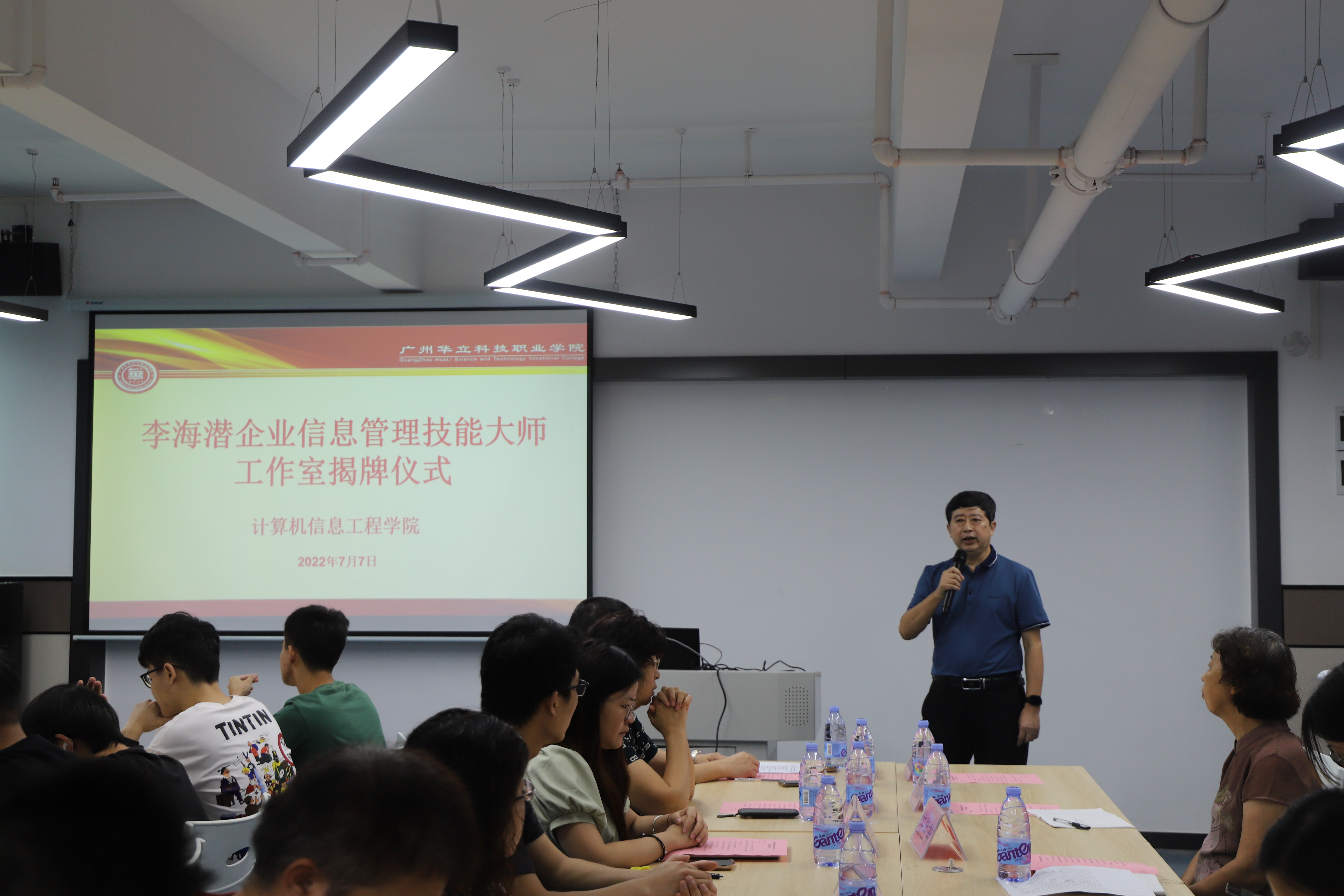 首先广州华立科技职业学院校长易健民教授讲话,对李海潜企业信息管理技能大师工作室的成立表示祝贺,工作室的成立是产教融合、校企合作的典型案例,此次揭牌进一步推进我校产教融合、校企合作,落实双主体育人,提高人才培养质量,提升学校办学水平。校企双方共同将“李海潜企业信息管理技能大师工作室”建设作为集项目开发、科技创新、人才培养和学术交流为一体的综合平台,充分发挥技能大师工作室对人才培养的作用,要把好的工艺、好的技术、好的精神传承下去,不断培养和造就高素质技术技能型人才。继续弘扬劳动精神,发挥技能大师工作室在带徒传技、技能攻关、技能推广等方面的重要作用。