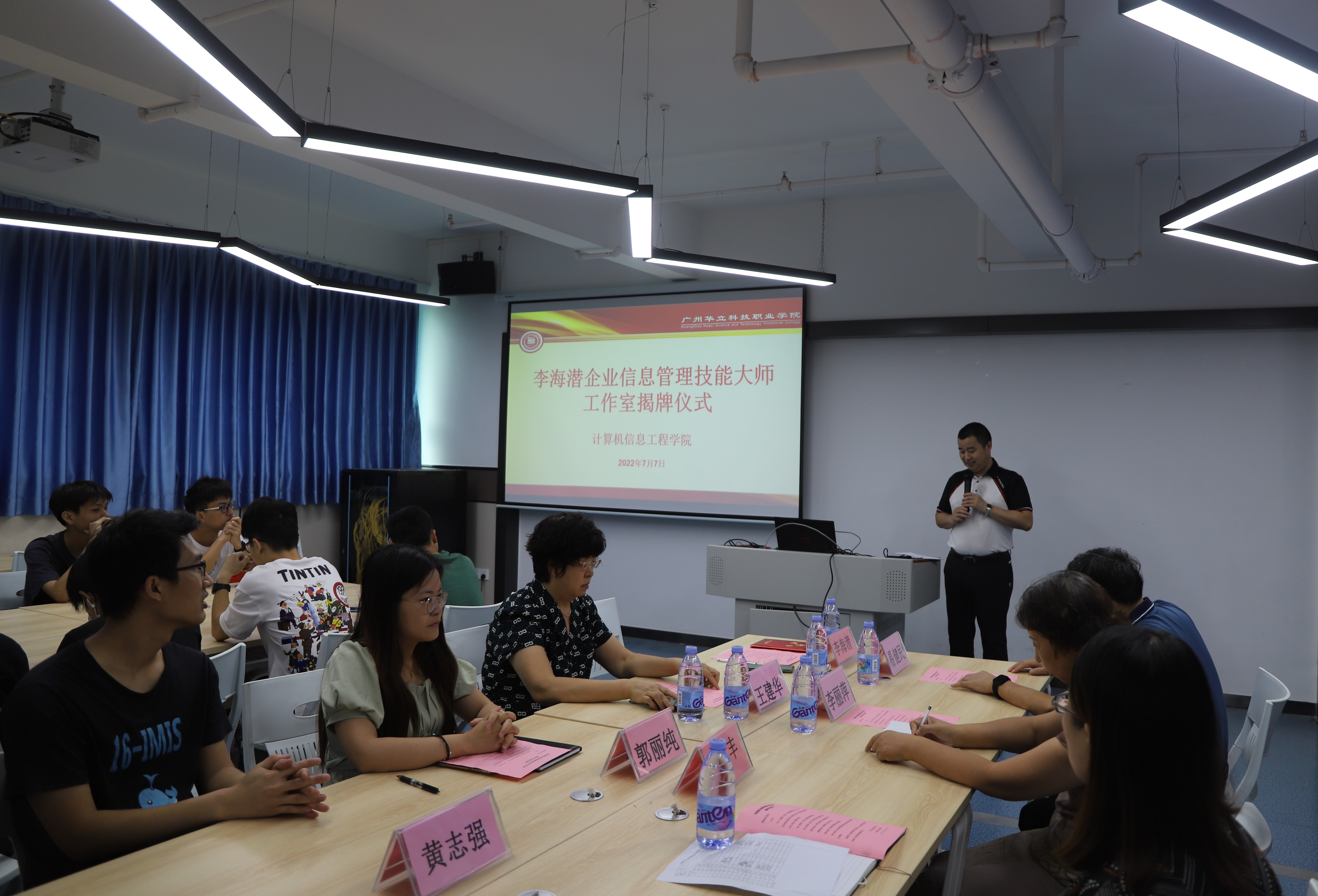 7月7日上午,李海潜企业信息管理技能大师工作室揭牌仪式在西三教学楼501举行。增城区企业家协会会长、工作室负责人李海潜、广州华立科技职业学院校长易健民教授、计算机信息工程学院院长王建华教授、产教融合办副主任陈茜以及计算机学院全体教师和学生代表参加了此次揭牌仪式。