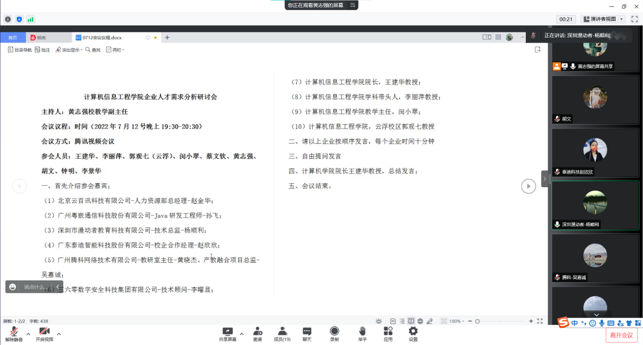 为能全面深入了解用人单位的人才需求情况,以便更好地进行人才培养方案的改革,我院特邀与各专业有深度合作的企业专家代表,于7月12日晚上19:30-20:30通过腾讯视频会议开展企业人才需求分析研讨会。