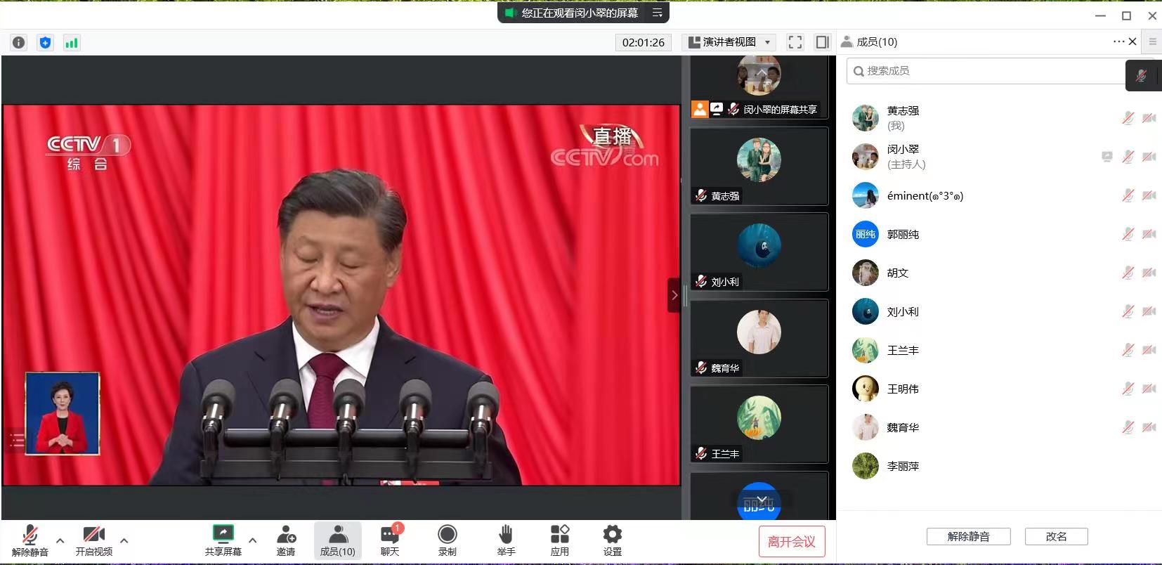 计算机学院党支部教师采用线上转播,视频会议模式观看开幕式直播,认真学习领会报告精神,并针对报告内容结合工作畅谈如何为实现中华民族复兴的伟大中国梦贡献力量。