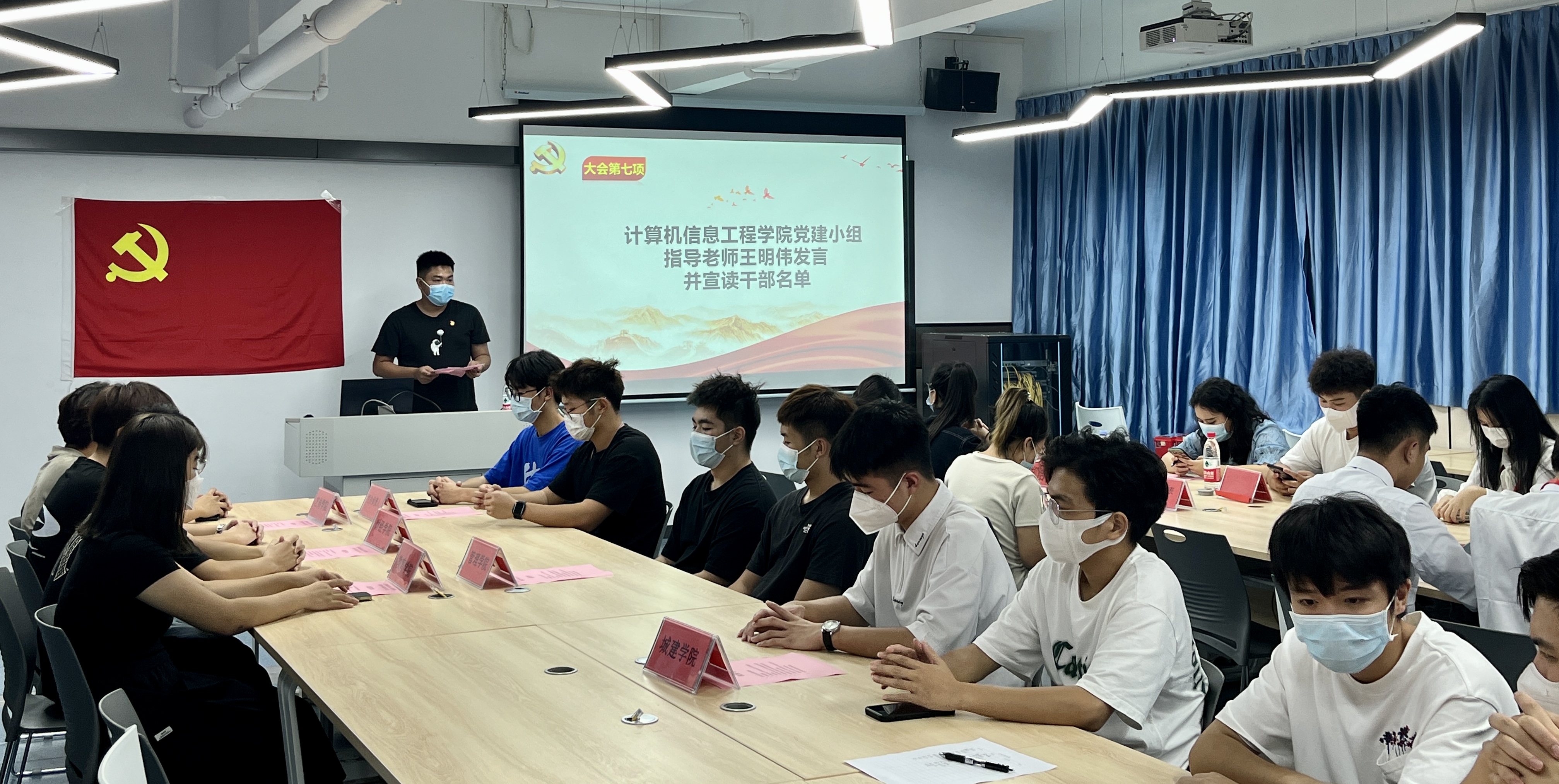 计算机信息工程学院党建小组于2022年11月15日下午18:00在西三-503教室召开了计算机信息工程学院第五届党建小组动员大会。出席本次大会的领导嘉宾分别是:计算机信息工程学院党总支副书记郭丽纯同志,健康学院党建小组指导老师郑洁仪老师,计算机学院党建小组指导老师王明伟同志, 22级辅导员胡蓉同志,计算机学院团委学生会代表,以及其他兄弟学院党建小组负责人代表。