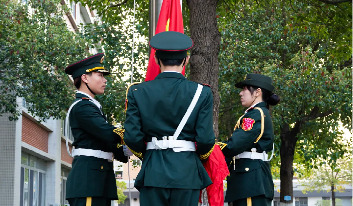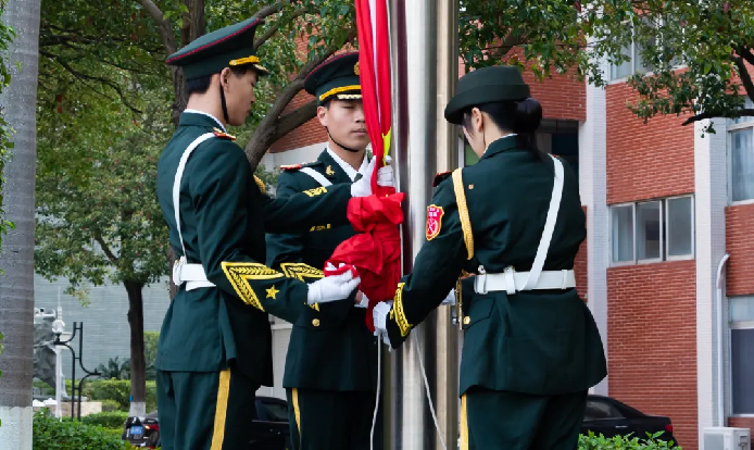 升旗仪式开始,国旗护卫队的旗手们迈着铿锵有力的步伐,护卫鲜艳的五星红旗入场。五星红旗冉冉升起,全体师生面向国旗,奏唱国歌,行注目礼,以饱满的精神状态向祖国致敬,表达对祖国母亲的无限热爱之情。