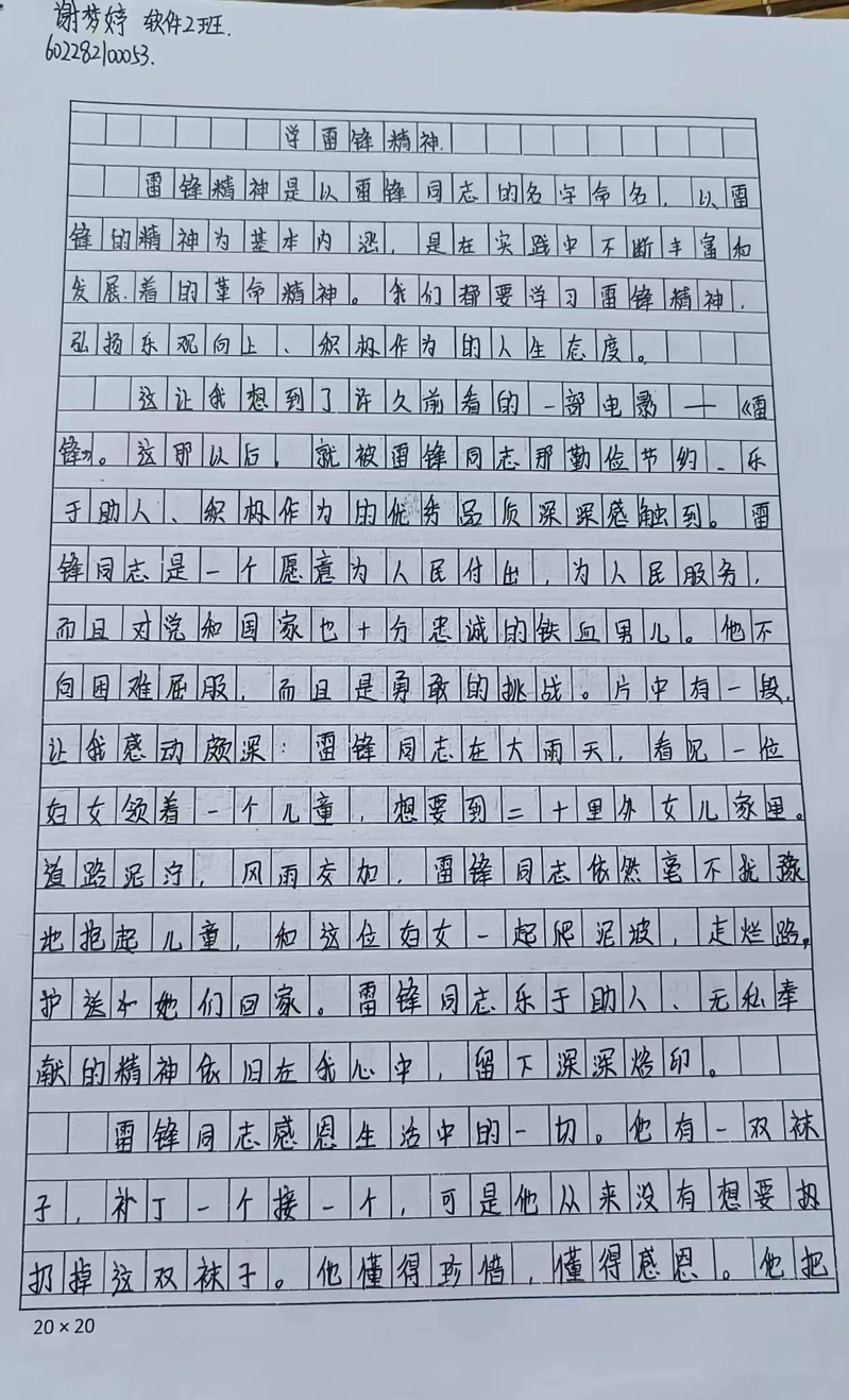 为深化学雷锋活动掀起学院学雷锋活动新高潮,不断丰富和发展新时期学雷锋活动的内涵和形式,树立当代优秀大学生的优良形象。计算机信息工程学院于2023年3月27日开展“学习雷锋精神”为主题的征文活动,希望每一位计算机学院的同学可以通过手中的笔,为身边的人送去一份爱心,送上一份祝福。