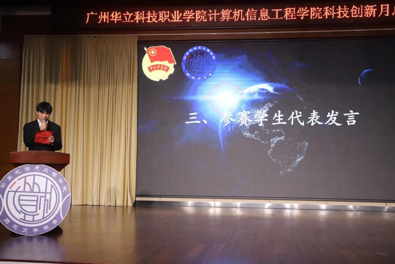 首先,由广州华立科技职业学院党委副书记、副校长高尧来副校长作大会致辞,高尧来副校长表示科技创新活动月举办三届以来取得了丰硕的成果,活动培养了同学们勤于思考、勇于创新、大胆实践的品质,对于促进大学生崇尚科学、认识科学、了解科学起到了很好的作用,同时也展示了广州华立科技职业学院广大学生与时俱进、开拓创新的精神风貌。