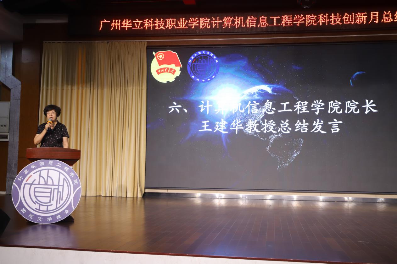大会最后,由广州华立科技职业学院计算机信息工程学院院长王建华教授为大会作总结发言,王建华教授表示本届科技创新活动月的开展高度体现了同学们的良好精神风貌,同时也希望同学们将在本次科技创新活动月中所学到的知识,所形成的严谨求实的作风和善于思考、勇于创新的科学精神,应用到日常学习中去,继续探索科技的奥秘,再创佳绩!