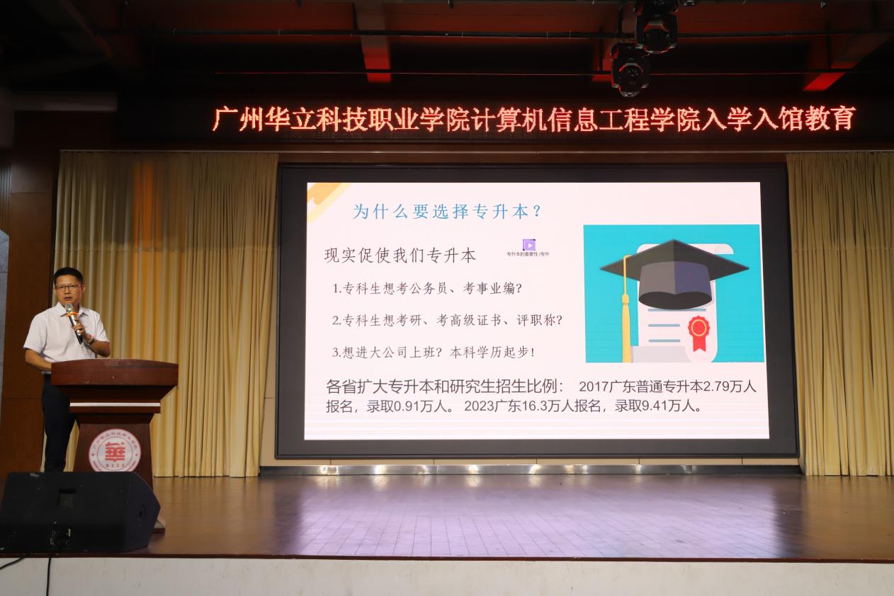 大会的最后由广州华立科技职业学院培训学院主任林志老师作专升本科普,林志老师从就业前景、社会发展趋势等方面向同学们强调了提升学历的意义及重要性,并详细介绍了“什么是普通专升本”及其学习形式和报考时间流程。使同学们对未来的学习目标有了更加明朗认知及规划。