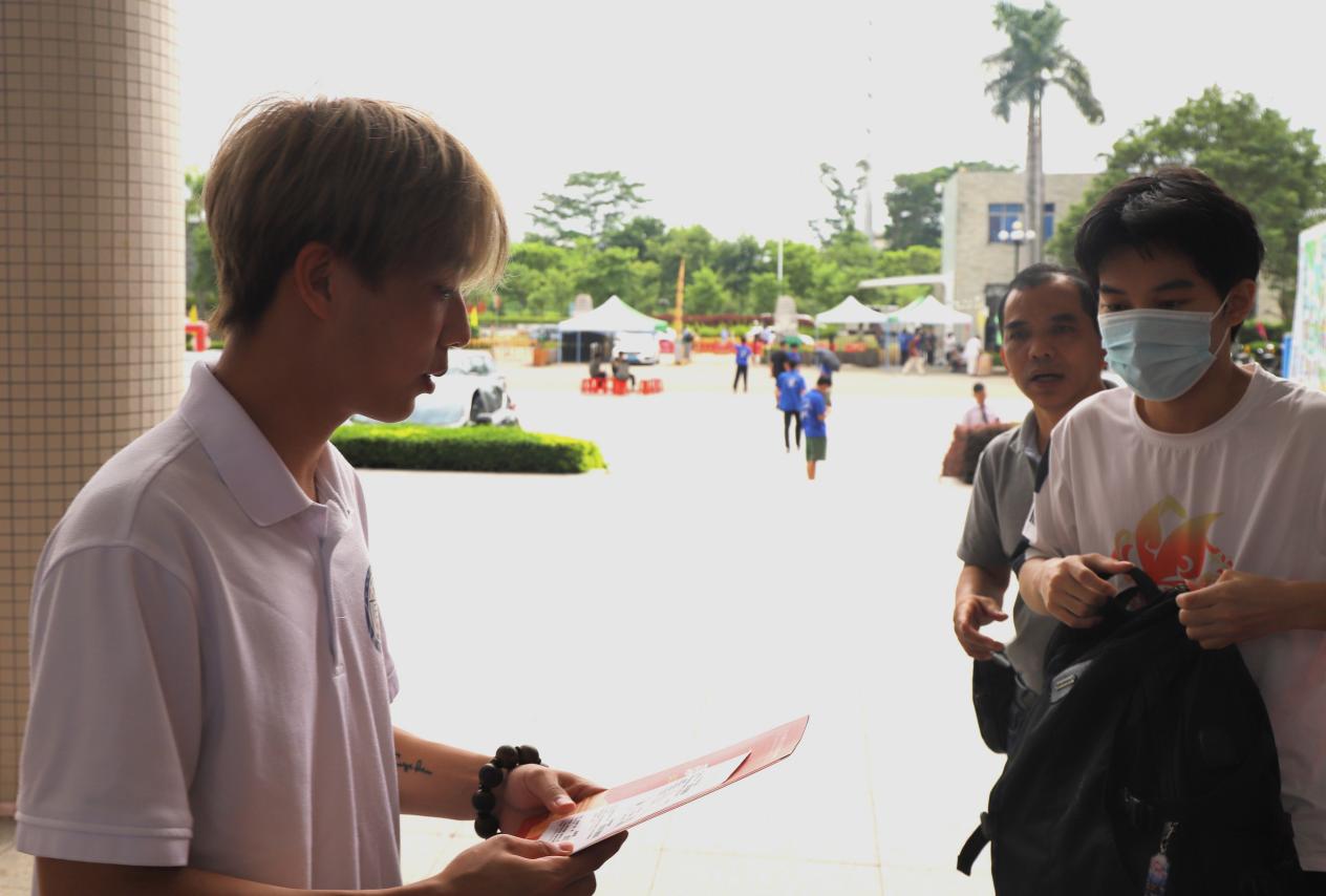 从进校门后,在综合楼大厅检录,再到科技楼进行注册报到,指引组指引新生按照新生报到入学流程一步一步地:核对录取通知书,填写信息登记表,领取入学资料、一卡通等。现场还有专业老师为家长和新生提供专业咨询,答疑解惑。力求给新生和家长们解决问题与困难。