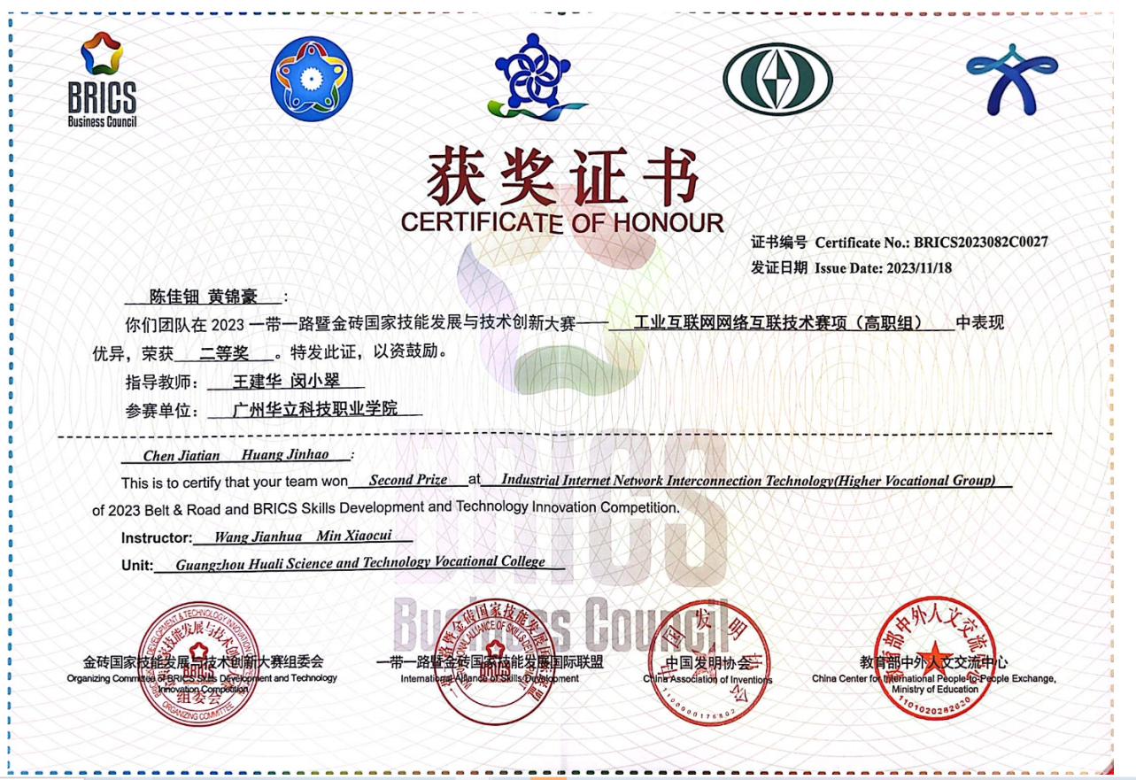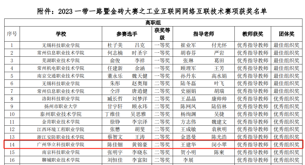 此外,广州华立科技职业学院凭借出色的组织能力和选手们的卓越表现,荣获了本次竞赛的优秀组织奖,这一奖项充分肯定了学院在组织管理和团队协作方面的实力和水平。王建华和闵小翠两位老师也因卓有成效的指导工作,获得了优秀指导老师的荣誉,他们的专业素养和教学能力得到了高度认可,为学院赢得了荣誉。