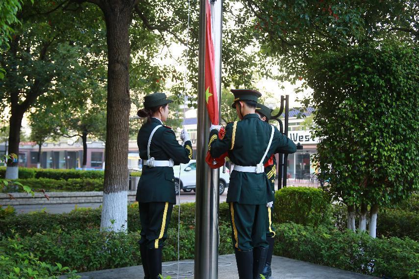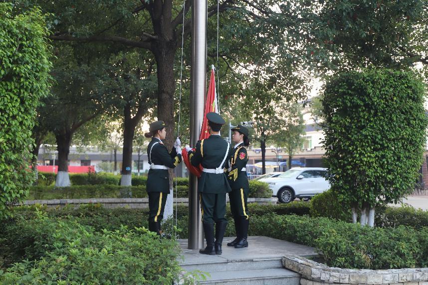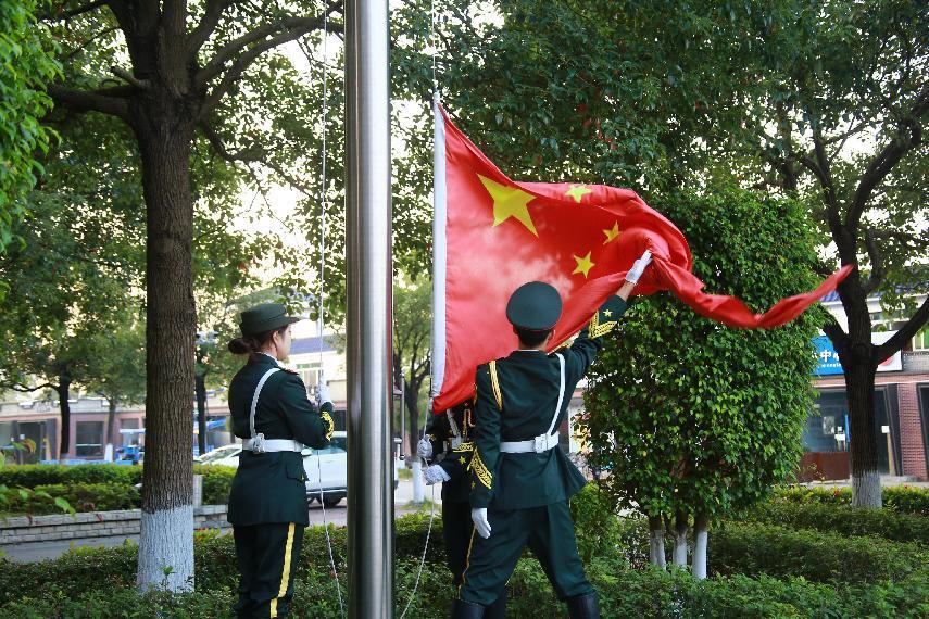 行礼完毕,伴随着庄严的《中华人民共和国国歌》,五星红旗冉冉升起,迎风飘扬。在场的每一个人向国旗行注目礼,深怀对祖国无限的热爱和崇高的敬意!