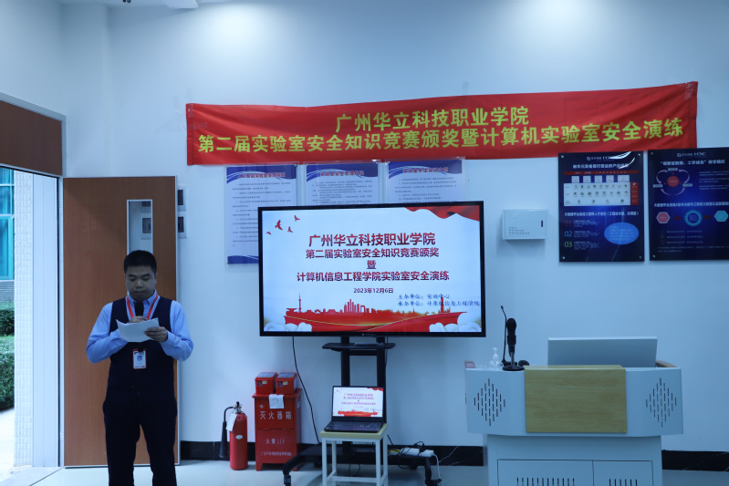 广州华立科技职业学院于2023年12月6日下午14:30,在西三-103举行了第二届实验室安全知识竞赛颁奖暨计算机信息工程学院实验室安全演练活动。本次活动的参与人员包括学校领导陈德清校长、高尧来副校长、叶春桃校长助理,以及王建华、陈胜军、彭柳、李桂林、张磊等相关负责人,实训中心老师,各二级学院代表和学生代表。