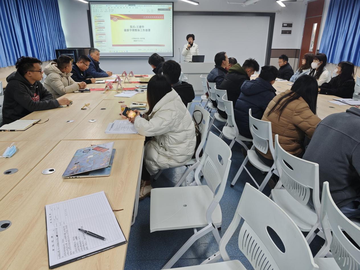 接着院长王建华教授对本学期工作作出部署。第一要加强教学管理、加强学生管理工作;第二要做好2024年科研项目立项工作准备和对“人工智能技术应用”教材进行改版内容更新;第三要做好“科技活动季”准备工作;第四要加强校企深入合作,申报省级产业学院和引企入校开展校企课题和竞赛等。