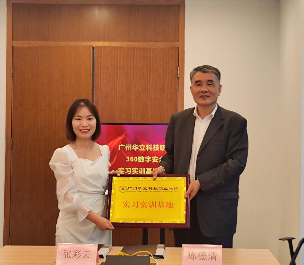 经双方达成合作意向后,进行了实践教学基地签约仪式,陈德清校长代表学校授予360公司广州华立科技职业学院实习训基地牌匾。双方将以此次交流和签约为契机,为下一步深度合作打下坚实基础,为学生实习就业搭建更好的平台。