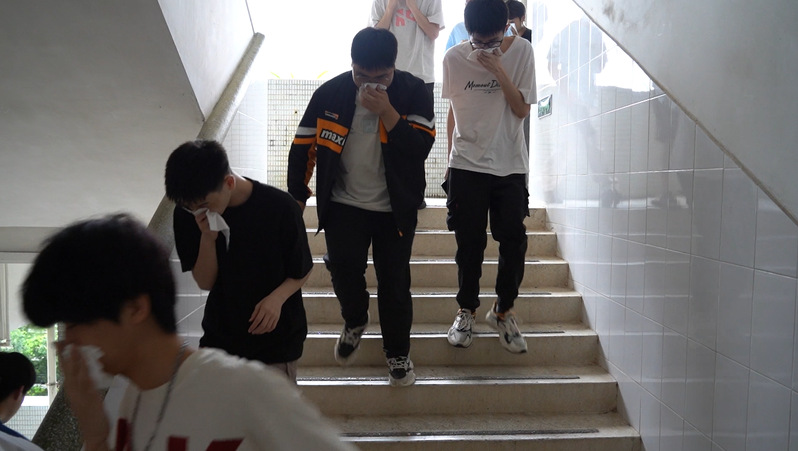 在任课老师的指挥下,学生们保持冷静,按照疏散路线有序撤离。前排学生前往前门撤离,通过西边楼梯快速下楼;后排学生则往后门撤离,利用东边楼梯安全离开。在疏散过程中,学生们严格遵守弯腰低姿、用衣服捂住口鼻等安全要领,有效防止了吸入有毒烟雾。