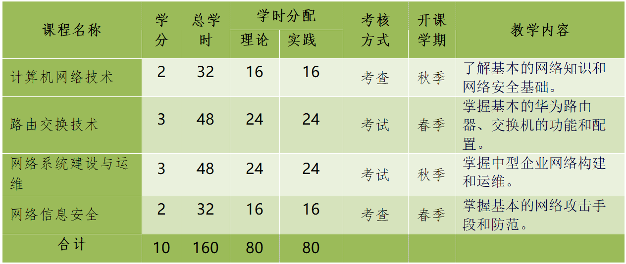 本专业培养具有良好的计算机网络基础和网络设计思维能力,掌握计算机网络的基础理论和专业知识,具有较好的实践能力,掌握网络设备配置和信息安全防护的基本方法,能够综合使用路由器、交换机等网络设备解决社会发展和企业生产中有关网络系统建设及网络安全实际问题的高素质复合型人才。