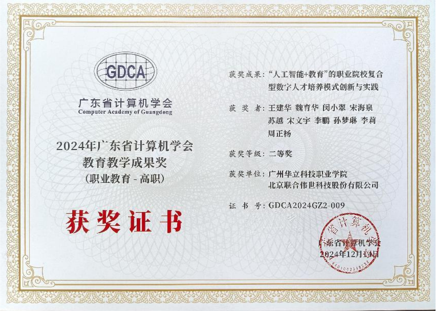 2024年12月14日,广东省计算机学会40周年庆典仪式隆重举行,在周年庆活动现场,宣布了2024年广东省计算机学会教育教学成果奖的获奖名单。经过选拔和专家评审,我院与企业联合申报的《“人工智能+教育”的职业院校复合型数字人才培养模式创新与实践》项目荣获“2024年广东省计算机学会教育教学成果(职业教育-高职)”二等奖,这一荣誉标志着我们在计算机教育工作上取得了可喜成绩,创新实践了“以人工智能为引领、以数字技术为核心、以实践应用为导向”的人才培养模式树立了新的标杆。