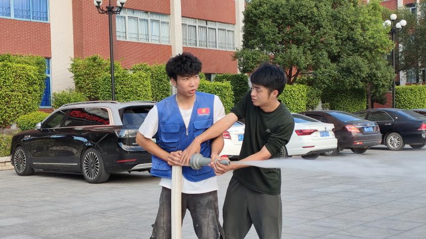 活动最后,利用消防水枪的讲解和实操体验,让学生真切的感受消防水枪的使用同时也对消防安全演练场地地面进行打扫,水枪也是消防中非常关键,也是非常有效的措施。