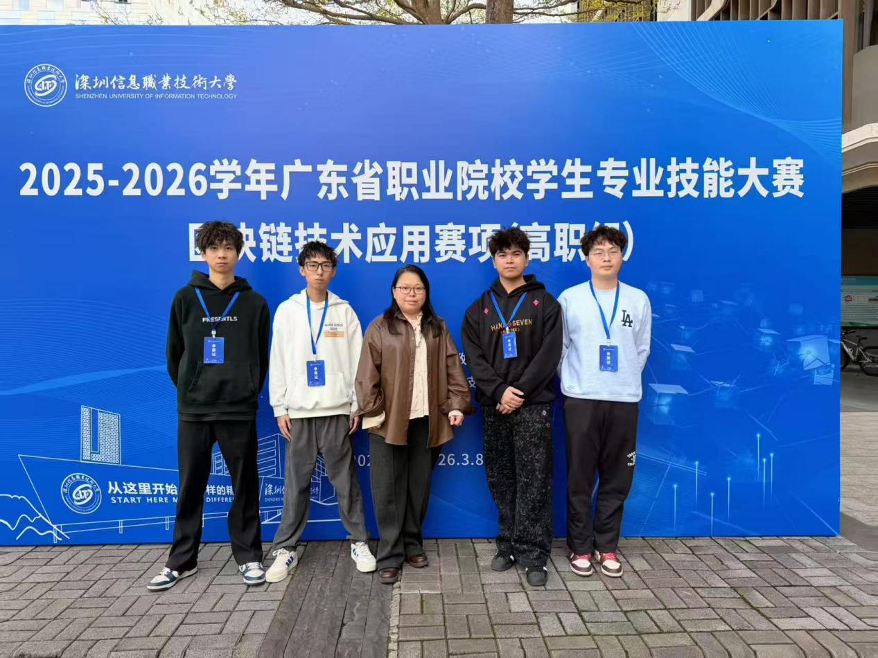 近日,2025—2026年广东省职业院校技能大赛“区块链技术应用”赛项在深圳信息职业技术大学落幕。来自全省53所职业院校的代表队同台竞技。我院蔡建州、欧建豪、吴禄嘉、黎明涛四名学生在闵小翠、王建华两位老师的指导下,最终荣获三等奖。