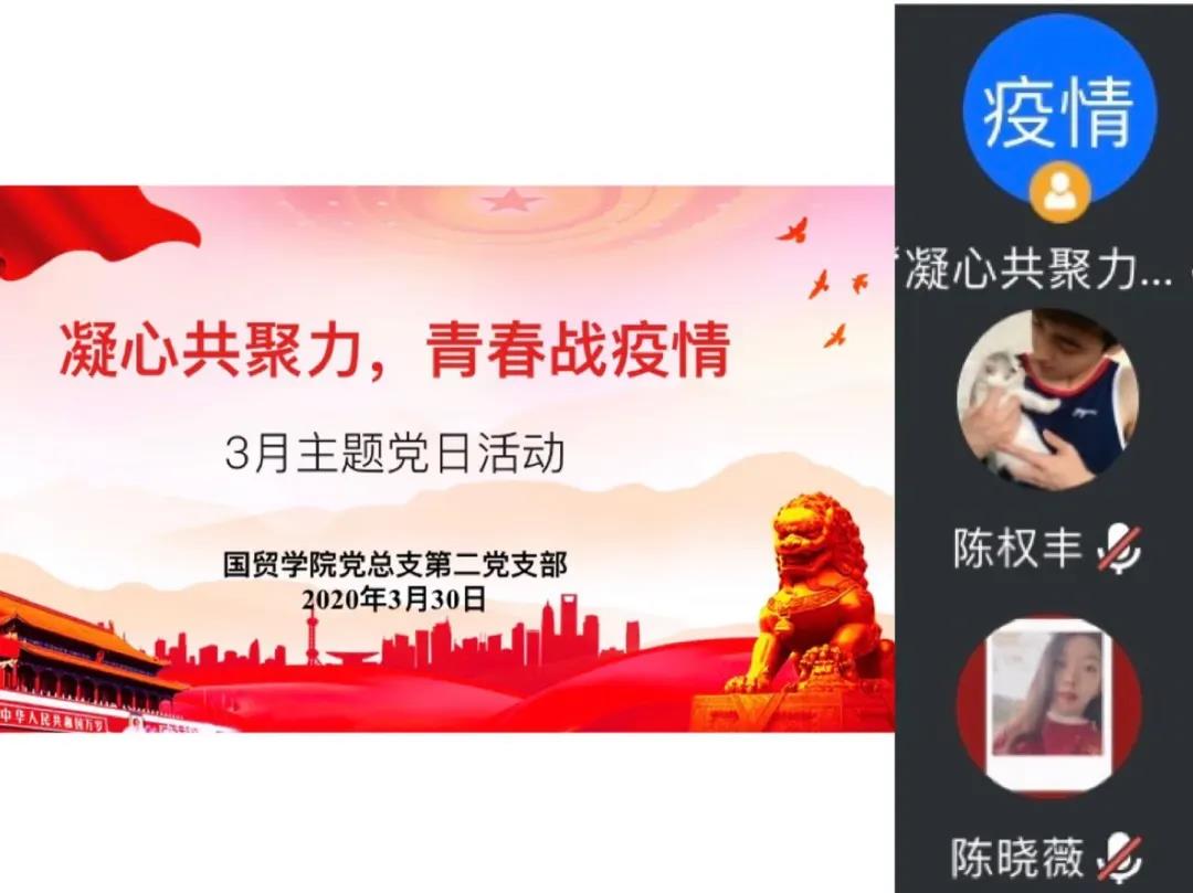 2020年3月30日星期一晚上七点,国贸学院党总支第二党支部在腾讯会议平台开展了“凝心共聚力,青春战疫情”组织生活会,参加本次会议的有国贸学院党总支第二党支部书记刘伟鑫老师、国贸学院党总支第二党支部组织宣传委员陈权丰老师、国贸学院党总支党建小组指导老师陈晓薇老师以及国贸学院全体学生党员。