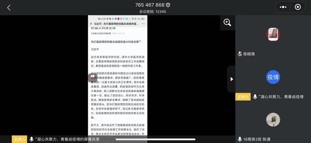 同时提醒了同学们在疫情期间做到不信谣不造谣,18级同学在家期间要遵守线上上课的规章制度,按时上课。17级在外实习的同学要注意安全。作为党员要有当担精神,要做到不忘初心。在会议中,国贸学院党总支第二党支部书记刘伟鑫老师给大家分享了报道习近平总书记《为打赢疫情防控阻击战提供强大科技支撑》的文章。此篇文章中提到了几点如下: