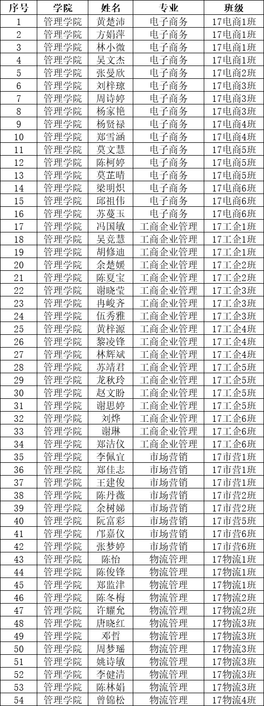 根据广州华立科技职业学院下发《华立职院学〔2020〕21号关于评选2020届优秀毕业生的通知》,为表彰先进,进一步调动广大同学们学习、就业的积极性,激发同学们奋发向上,创建良好的学风校风,在就业创业中努力进取,管理学院应学校要求在2020届毕业生中开展评选优秀毕业生的活动。经个人申请,管理学院辅导员、校外实习指导老师共同推荐,学院领导审核,我学院拟将推荐黄楚沛等54位同学为2020届优秀毕业生。现将2020届优秀毕业生的名单公示如下(具体名单见下表):