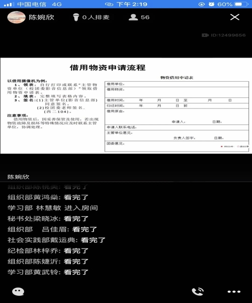 2020418日下午2点,会计学院团总支副书记陈婉欣通过QQ直播给大家讲解了借用物资的申请流程。
