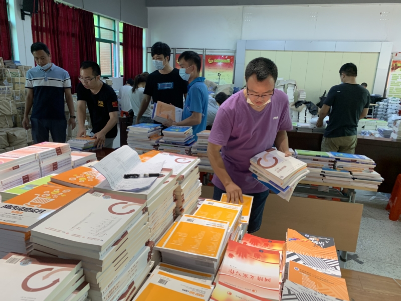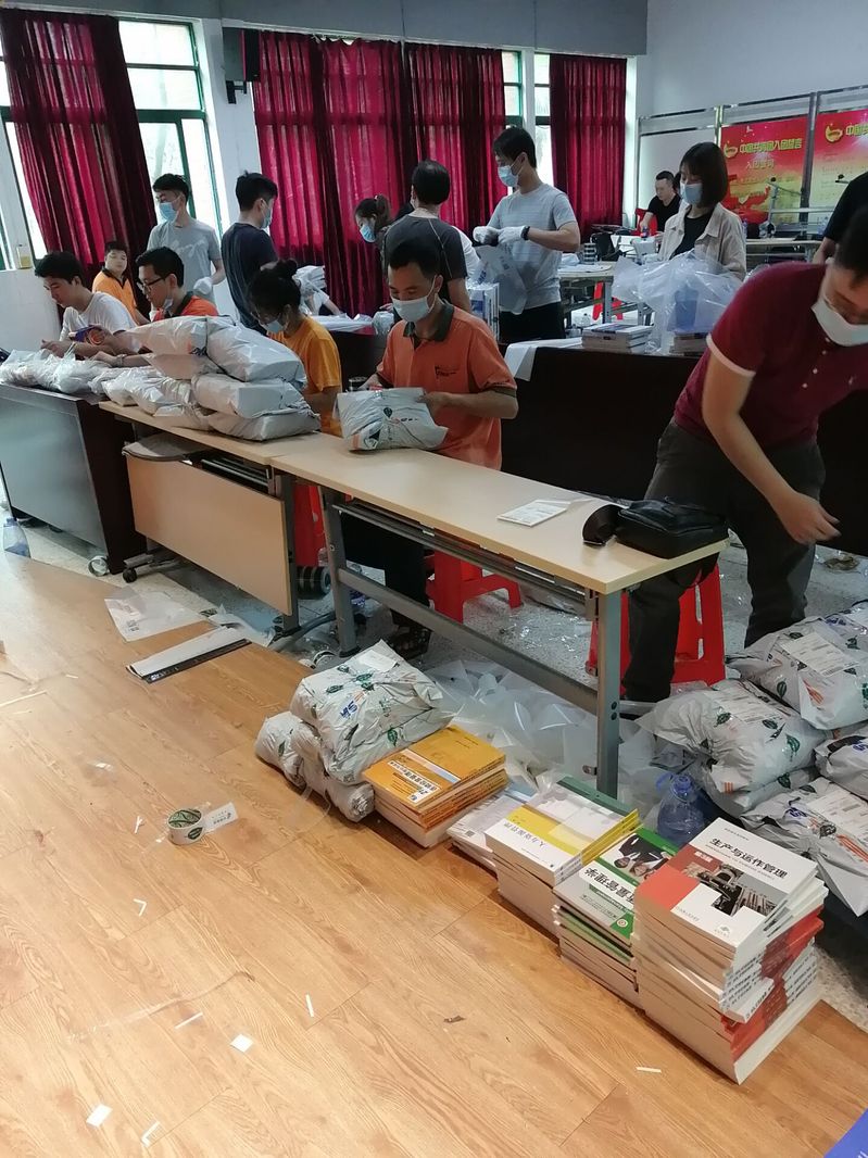 在疫情期间,我院遵照教育部门及学校的要求,及时开展了网络教学工作。为充分保证学生线上学习的效果,最大限度降低疫情对教育教学和学生学习的影响,学校与邮政快递公司合作,为疫情期间不能返校的学生及时邮寄了全部教材。5月14-16日三天,在教务处统一安排下,我院领导高度重视,组织安排了四线主任唐涛、王映丽、李远兴、康信恩,以及居住在增城附近的汪蔚、黄英、韦玉、赵林创老师参与了学生教材的分拣、打包、邮寄工作,将线上教学需要使用的学习、教材、资料及时送到学生手中。