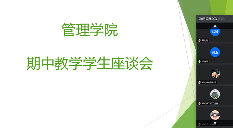 为了贯彻学院“创新强院、管院再出发”的发展理念,为进一步提高学院教学质量,掌握学院网络教学动态,提升学院日常教学管理能力,管理学院于5月25日晚19:30,以腾讯会议方式召开了本学期期中教学学生座谈会。参加本次座谈会的领导和老师有管理学院张良卫(副)院长,戴玉林副院长,校内教学主任康信恩老师,教务员以及2018级、2019级学生代表。本次座谈会由康信恩老师主持。