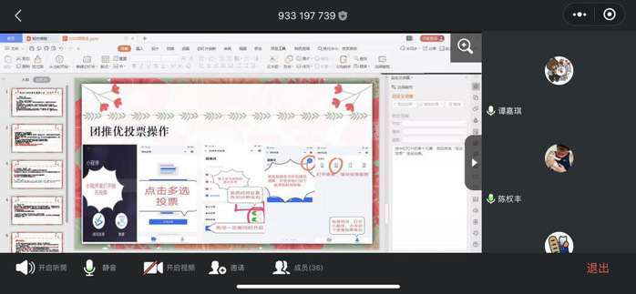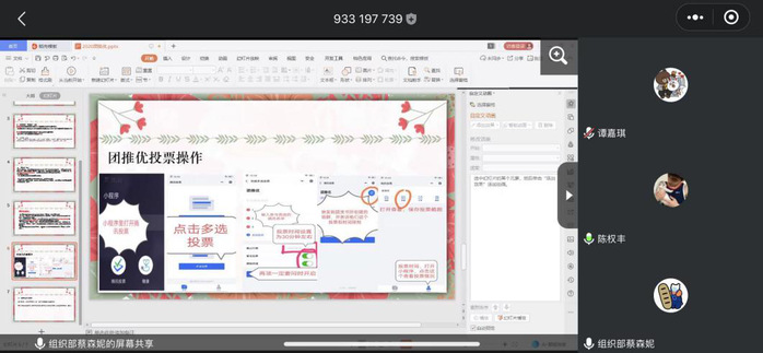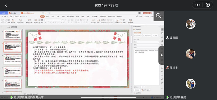 国贸学院团总支学生会组织部部长蔡森妮同学详细向18、19级团支书介绍了有关团推优需要注意的事项:一、本次团推优对象为我校在读的18、19级团员,参与团推优者需要符合团推优的基本条件才可进行团推优。二、各个团支部有一定的团推优人数,在团推优过程中要公平公正不能出现包庇、争锋相对的现象。三、团推优和团支部大会的程序:由于疫情影响,今年的团推优程序在线上开展,由团支部召开支部团员大会。