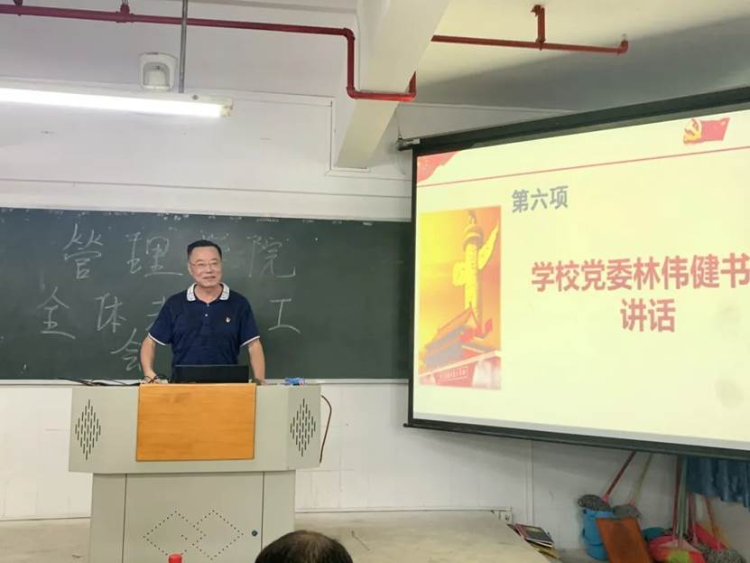 会议第六项,学校党委林伟健书记总结发言,他肯定了管理学院全体教职工对学院党建工作的付出和努力,展现了我们的新时代官员精神,并对管理学院教职工提出以下几点要求: