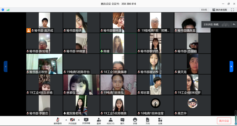 首先,由管理学院团总支书记陈媛老师讲话,她说到:对脱颖而出进入决赛的10位同学表示祝贺,线上演讲给予同学们一个自我展示的机会,同时也能让同学们在繁重的网课学习期间里带来一些丰富多彩的活动,同时预祝同学们在比赛中取得优异的成绩。