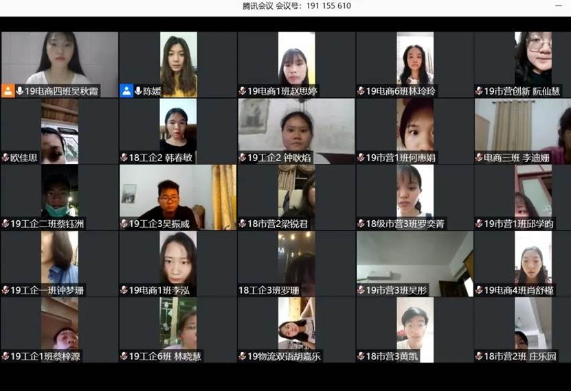 颁奖大会于202063日晚上730腾讯会议上举行。参加人员:管理学院团总支书记陈媛老师、团总支书记助理莫佩珊同学、团总支常务副书记丁伟金同学、学生会主席黄天龙同学、学生会副主席陈嘉琪同学以及管理学院1819级活动参赛同学、主持人吴秋霞同学。