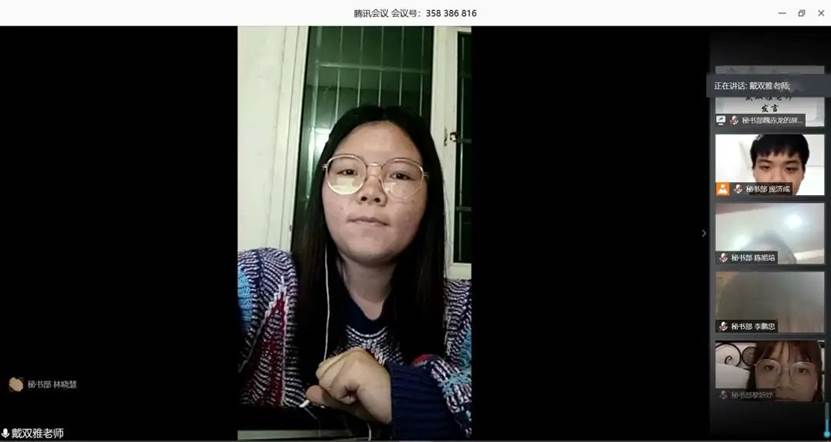 首先,由管理学院团总支书记陈媛老师讲话,她说到:对脱颖而出进入决赛的10位同学表示祝贺,线上演讲给予同学们一个自我展示的机会,同时也能让同学们在繁重的网课学习期间里带来一些丰富多彩的活动,同时预祝同学们在比赛中取得优异的成绩。