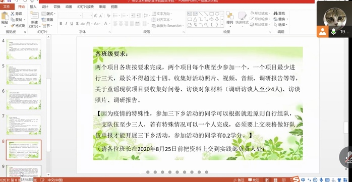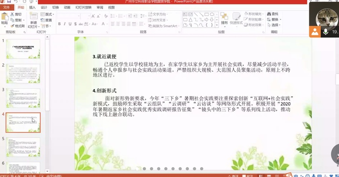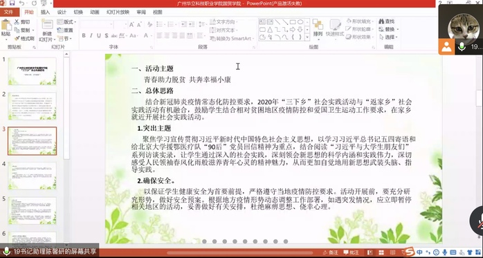 首先,陈馨妍同学给大家讲述活动的主题,是以“青春助力脱贫,共奔幸福小康”为主题的三下乡社会实践活动。讲解活动的总体思路,要结合新冠肺炎疫情常态化防控要求,鼓励学生结合相对贫困地区疫情和爱国卫生运动工作要求,在家乡就近开展社会实践活动,活动要求突出主题,确保安全,就近就便,创新行式。