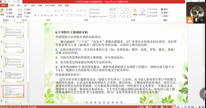 接着,谈到专项特色主题调研实践。分别是共青团助力乡村振兴调研实践项目和岭南童谣现状项目;共青团助力乡村振兴调研实践项目通过2020年“三下乡”“返家乡”暑假志愿服务。对广东省内乡村就业创业青年、农村青年致富带头人等进行针对性的访谈。岭南童谣现状项目是结合多彩乡村为主题的教育活动,鼓励大学生深入广大农村,从当地儿童或者长辈口中挖掘当地的特色童谣,让大学生通过调研童谣作品,更加深入地了解岭南童谣的历史文化背景与发展现状。