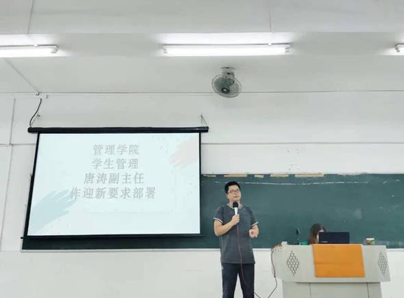 紧接着,由管理学院学生管理唐涛副主任对本次迎新工作做出要求:他希望全体迎新工作人员要以热情的工作态度对待新生及家长,要充分体现管理学院对新生的人文关怀,并强调在疫情防控期间,各工作人员要做好个人防护,在保证个人以及新生安全情况下开展工作。