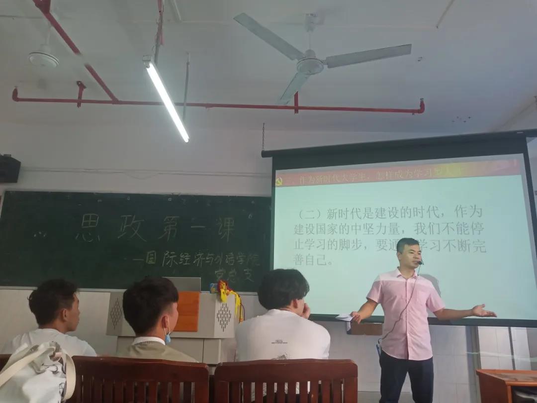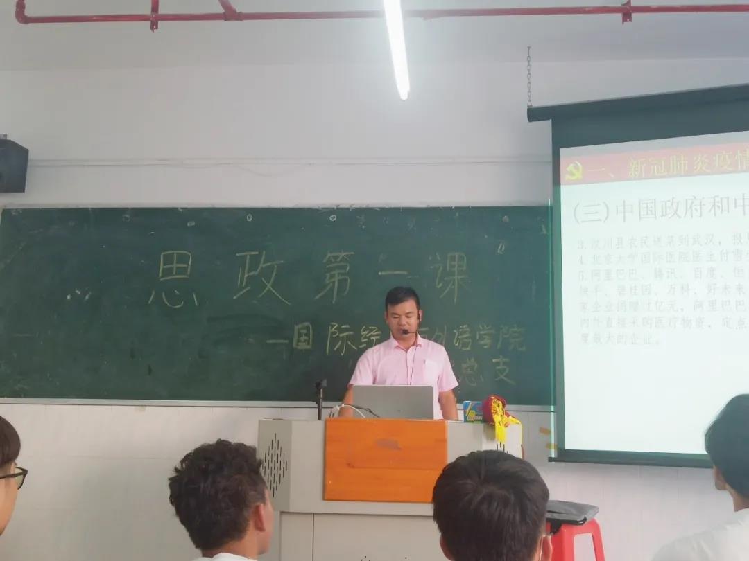 为了提高同学们对新冠肺炎疫情的防范性和学习的积极性,国际经济与外语学院党总支于2020年9月20日下午4点10分在西一教学楼409开展了思政第一课的活动。参与人员有国贸学院党总支党建小组队长以及2020级新生。主题是“聚焦疫情防控,做学习型的新时代青年”。本次活动由国贸学院第二党支部书记刘伟鑫老师进行演讲。